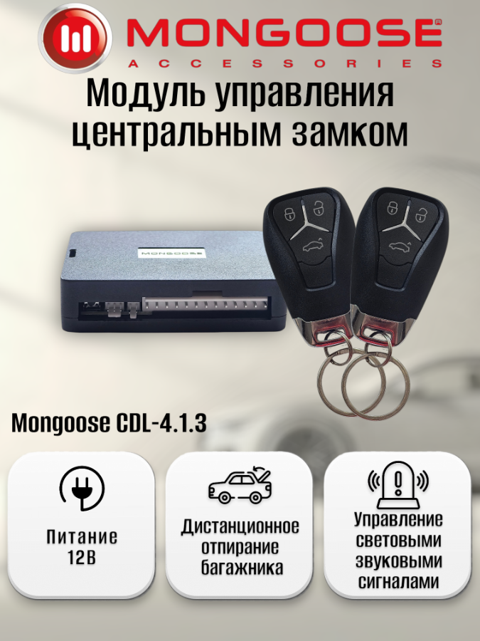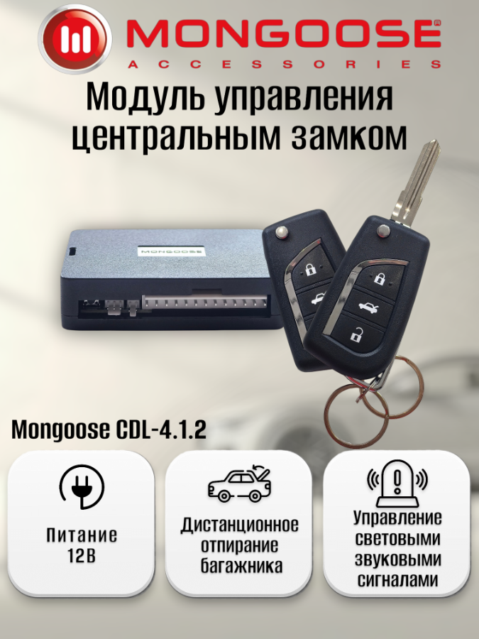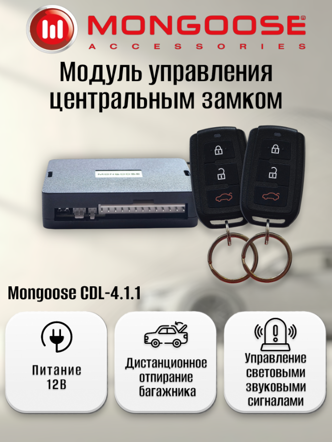 Модуль оснащен силовыми реле отпирания/запирания и управления световой индикацией, слаботочным выходом отпирания багажника.
