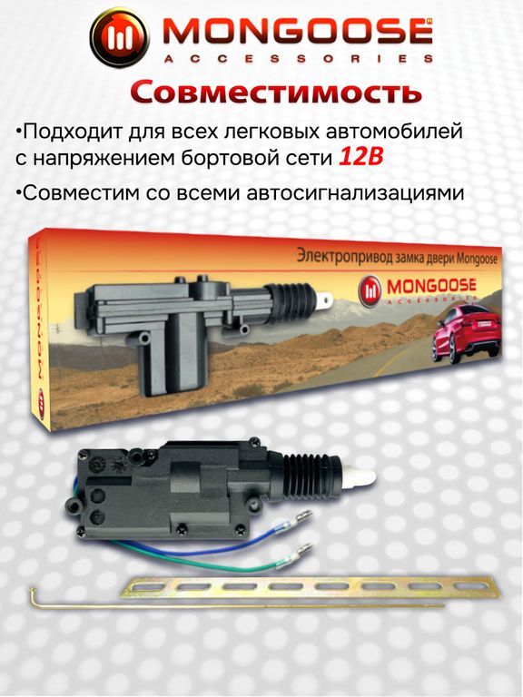Активный соленоид/актуатор/активатор двери. Mongoose Mon-Ac-2SB - это 2-проводный электропривод замка двери, который служит для фиксации ригеля в положении "открыто" или "закрыто". Дверной универсальный электропривод замков универсален и подходит для всех автомобилей с напряжением бортовой сети 12В, привод Mongoose Mon-Ac-2SB совместим с любыми типами автосигнализаций. Актуатор оснащен мощным электродвигателем с тяговым усилием 10кг!, вращающейся на 360 градусов присоединительной головкой. В комплекте имеются необходимые для монтажа приспособления, разъемы и крепления.